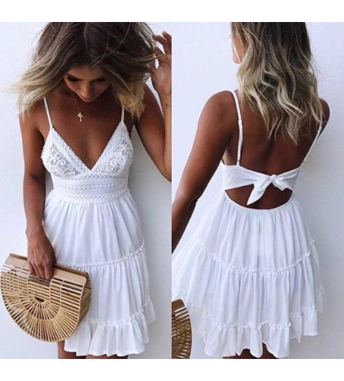 kadin bej v yakali kisa yazlik elbise